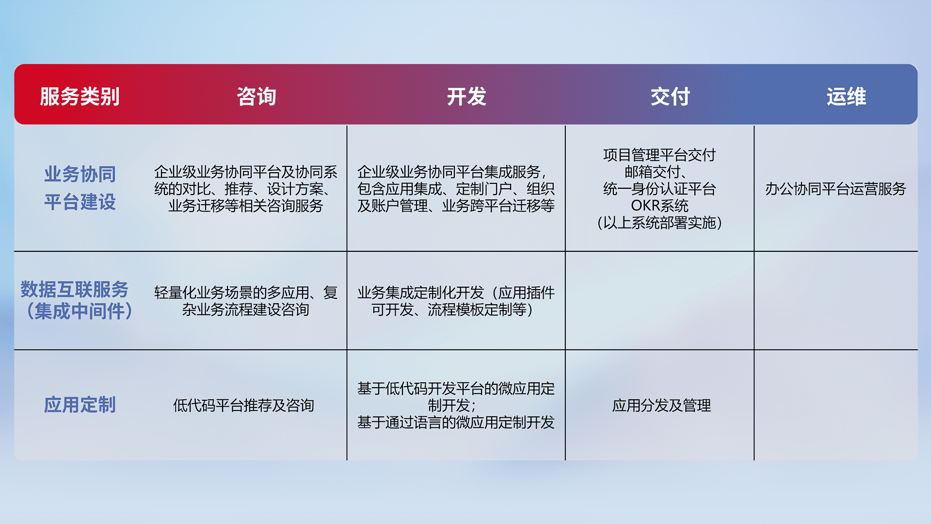 针对钉钉、、、、企微、、IDaas等平台级产品提供产品的规划、、方案、、、、交付、、、、定制化开发等服务,,,实现如统一协同办公、、、智能客户服务、、混合会议管理、、、智能数据查询、、、、等业务场景,,,,实现数字化转型。。。